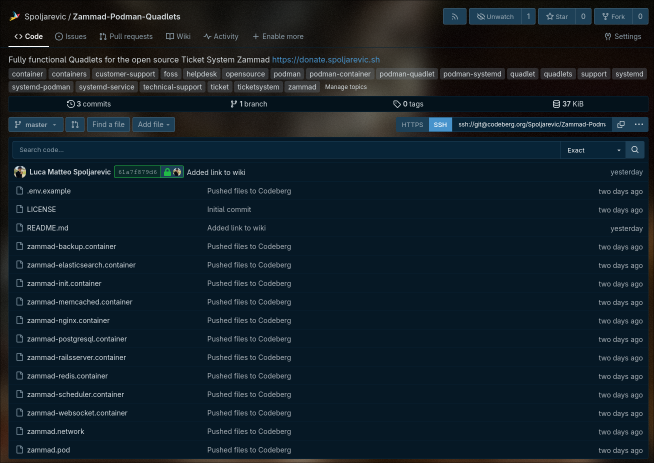 As you may have noticed when looking at my Repos, there's a new one. This is for my April project which I'm already working on. Converting the Compose of the Ticket System Zammad into fully working Quadlets files. At the time of writing this (14.03.2026), I already got the containers running and am only facing a problem with the Nginx of Zammad loading the UI.